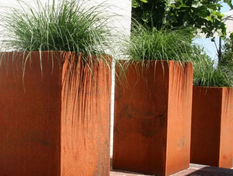 CorTen er en meget stærk 2mm stål/alu sammensætning som har den egenskab at det dækker sig selv med overfladerust, som også er beskyttende imod direkte korossion af materialet når de er placeret udendørs.