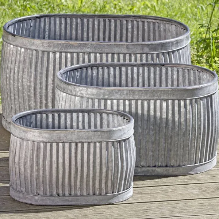 Store plantekrukker i super flot design med riller / “foldet look” – leveres uden bundhul og er som sådan vandtætte, men skal de bruges indendørs bør du fore dem med plast inden du planter for at skåne metallet. God kvalitet i kraftig metal med zink look. Anbefales som potteskjuler med anden vandtæt potte indeni (indendørs).