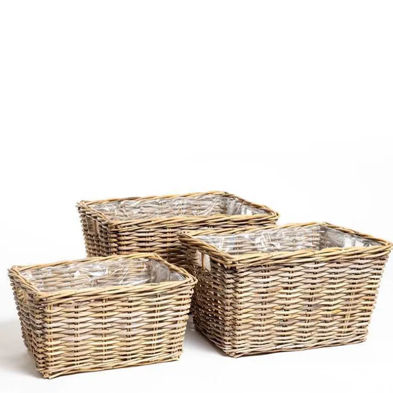Her får du 3stk flettede plantekurve i flettet pil med plastindsats og indbygget håndtag i enden – super fine til terrassen eller hvor du ønsker en lille oase af planter.