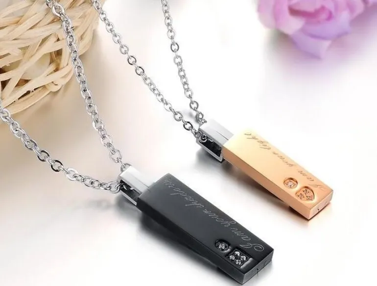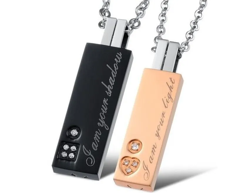 Her får du et sæt med 2 smarte halskæder i rustfri nikkelfri stål med flotte vedhæng – gyldent til hende og sort til ham. Indfattede små zirkoner og tekst giver halskæderne liv og charme.