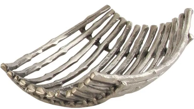 Flot rustikt buet fad / frugtfad med stænger i rå aluminium – 32cm