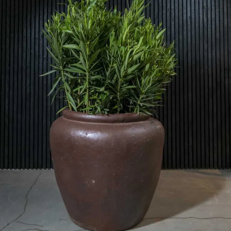 Store smukke klassiske let glaserede krukker i black clay ironstone – hårdtbrændte frostsikre krukker til store planter eller træer. Nuancen er mørk brun og med svingende let rustik overflade.