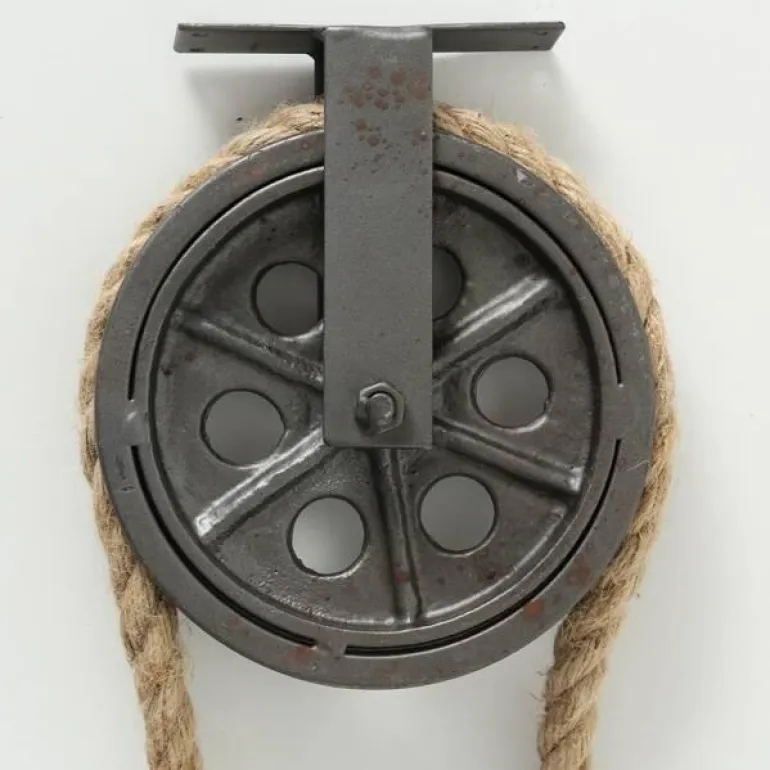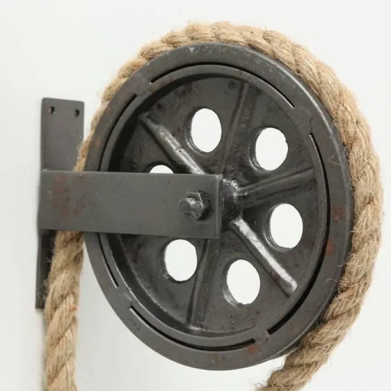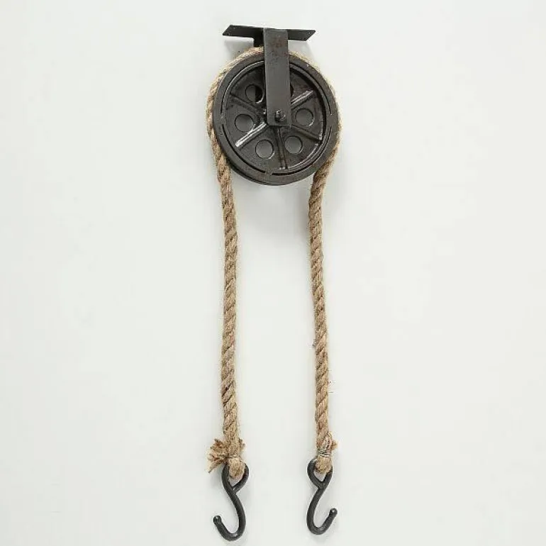 Speciel og rustik måde at hænge dit tøj eller andre ting på med dette “hejseværk” – jernhjul med reb og 2 jernkroge. Utrolig dekorativ indslag til både entre, bad og køkken, hvor noget skal hænge på den fede måde.