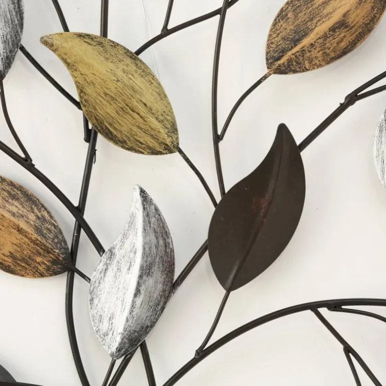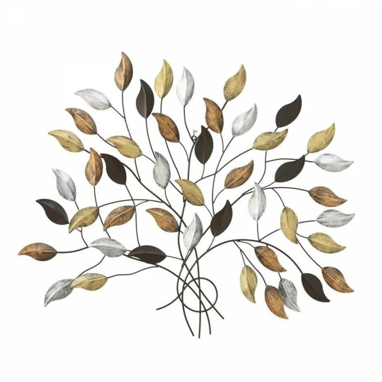 Flot og enkel vægrelief i metal med blade i sort, sølv, kobber og guld – L.103cm