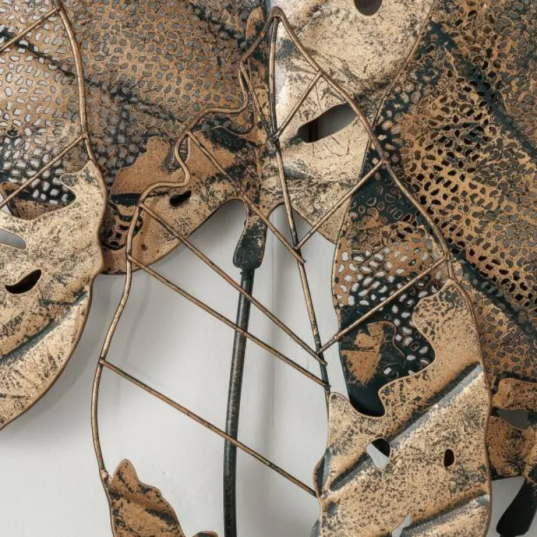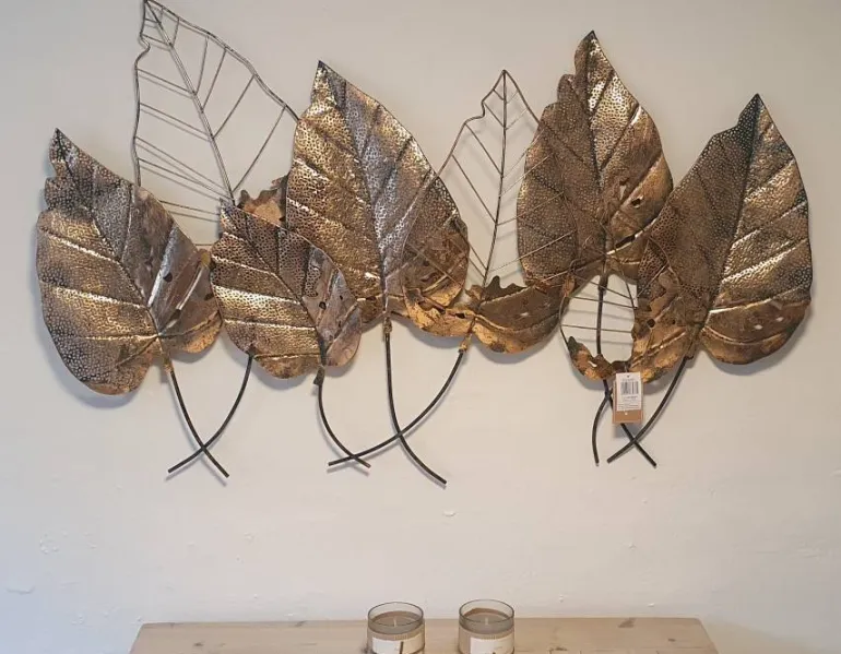 med smukke antik gyldne / messingtonede blade i hånddekoreret metal – Let og luftig hånddekoreret vægdekoration med naturtema, som fanger øjet med sin rolige fremtoning.