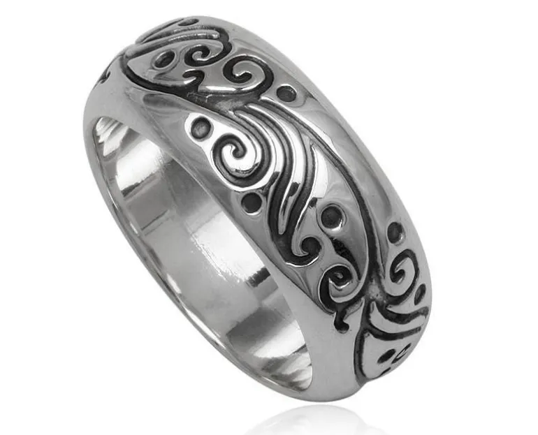 Super flot fingerring til mænd – tribal design med sort bund i mønstret som giver sølvringen karakter – super flot og anderledes sølvfingerring.