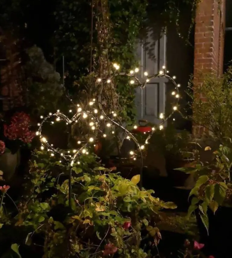 2stk dekorative hjerter som er bukket i ubehandlet Ø.8mm rå jern – Kan bruges som flot dekoration både i haven, i krukker og plantekasser eller evt som holdere til lyskæder (lyskæder følger ikke med)