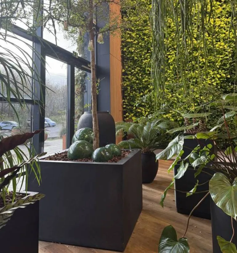 Få de helt store planter og træer indendørs med disse kæmpe krukker i fiberstone – 90×90 eller 110x110cm eller 140x140cm .