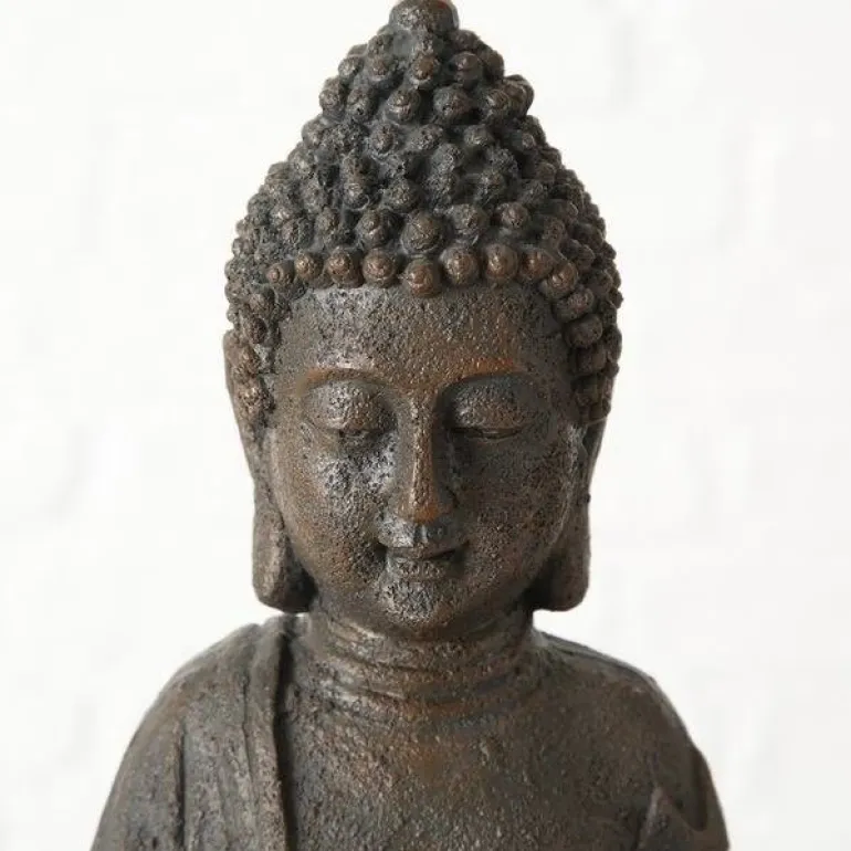 Flot Buddha med glas til fyrfadslys – fremstillet i holdbar polystone med et rustikt look.