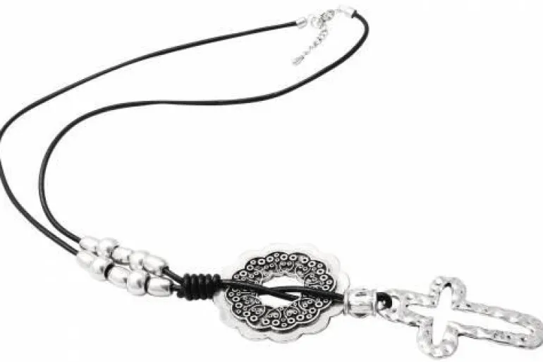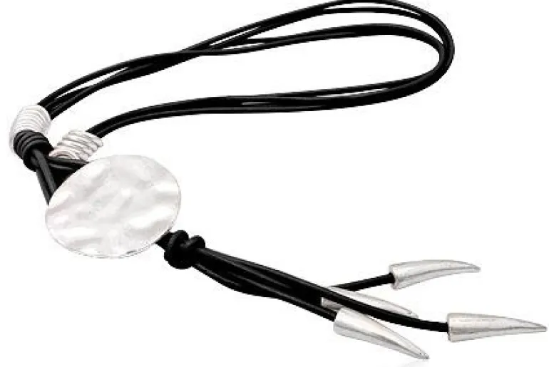 Flot design til hende med rigtig god stil. Nikkelfri metal. Halskæderne er med sorte lædersnore, monteret med forskellige flotte metaldetaljer.
