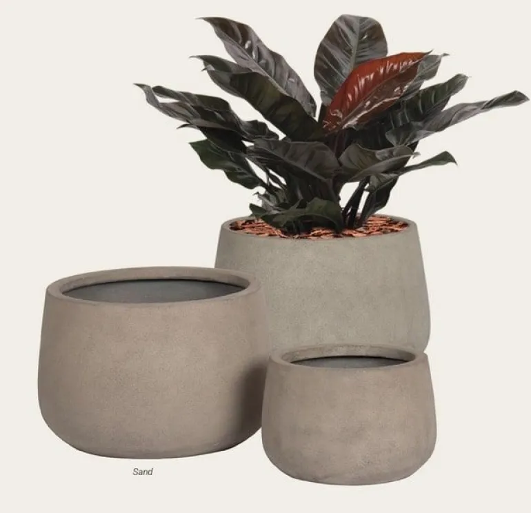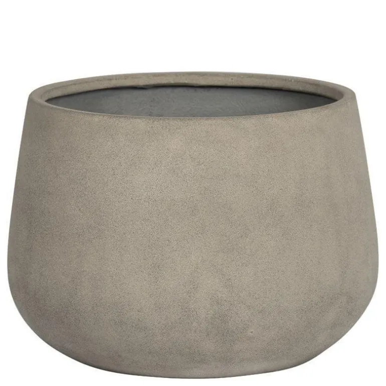 Rigtig flot rund lav krukke i letvægts Fiberstone materiale – Denne lave plantekrukke leveres UDEN bundhul og i en let konisk form.