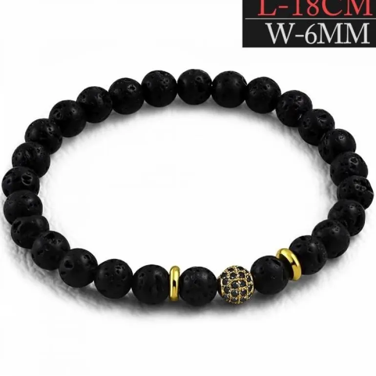 Eksklusivt elastisk armbånd med sorte lavakugler, gyldne spacere og centerkugle med sorte CZ sten. Fås i 2 tykkelser.