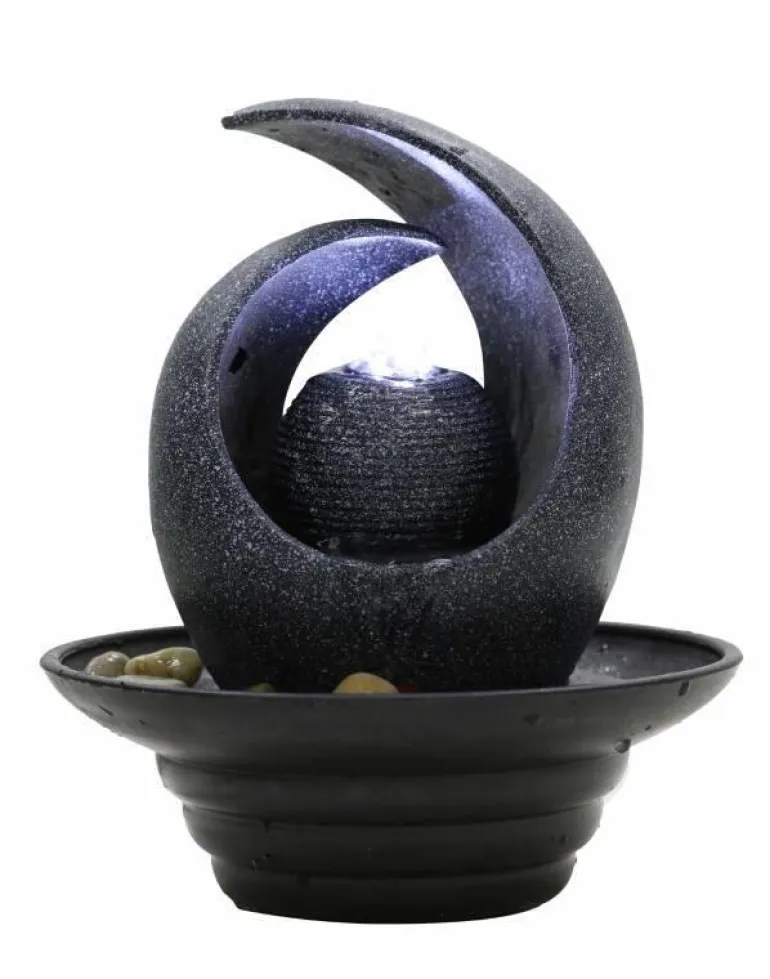 Flot lille vandkunst med LED lys og pumpe – indendørs vandfontæne til borde og reoler.