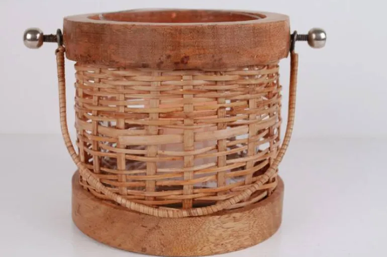 Flot 13cm natur lanterne i flettet pil med træskiver og glasindsats