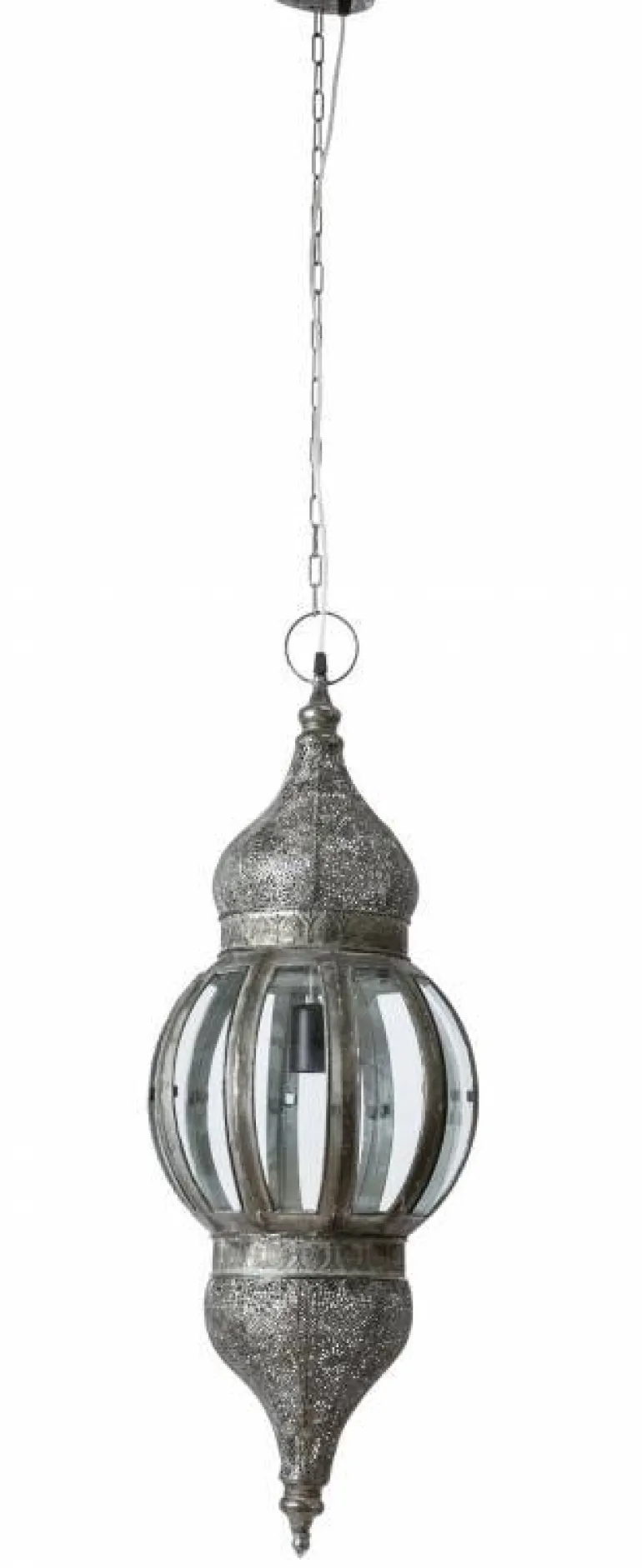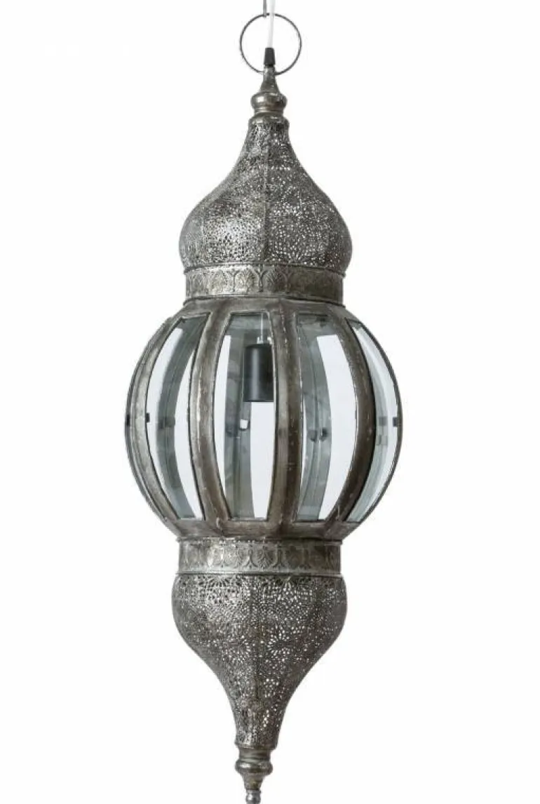 Fremstillet i metal med kæde og loftroset. Nostalgisk og kulturel loftslampe der spreder stemning og råhygge med lysmønstre på vægge og loft.