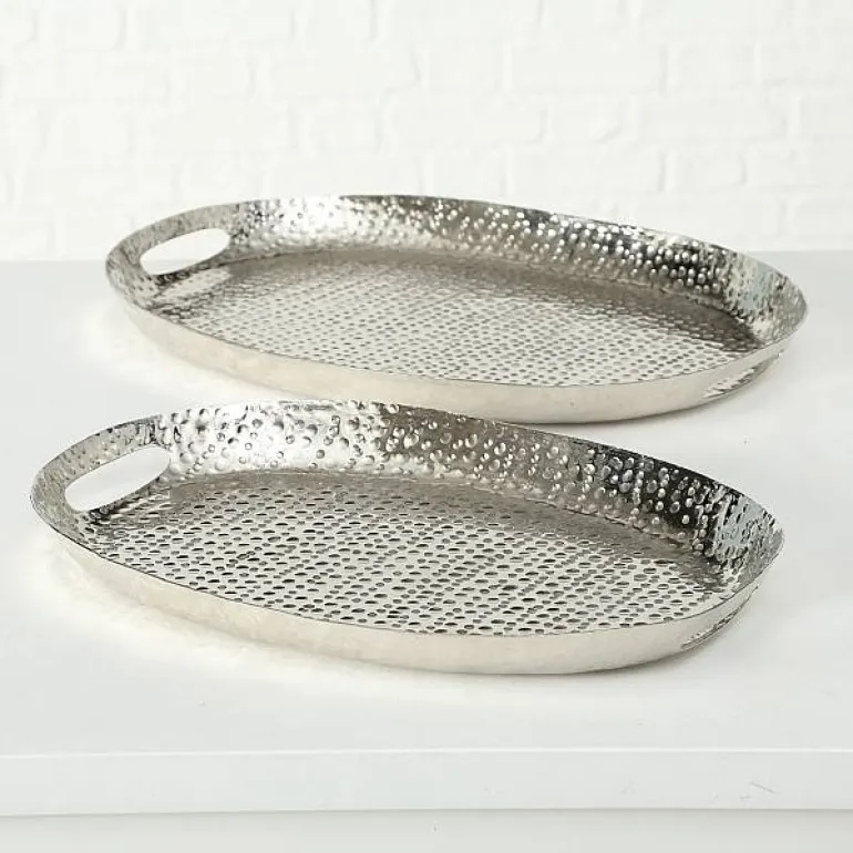 Aflange ovale fade til servering, dekoration eller bloklys – håndbanket mønster i højpoleret aluminium med håndtag.
