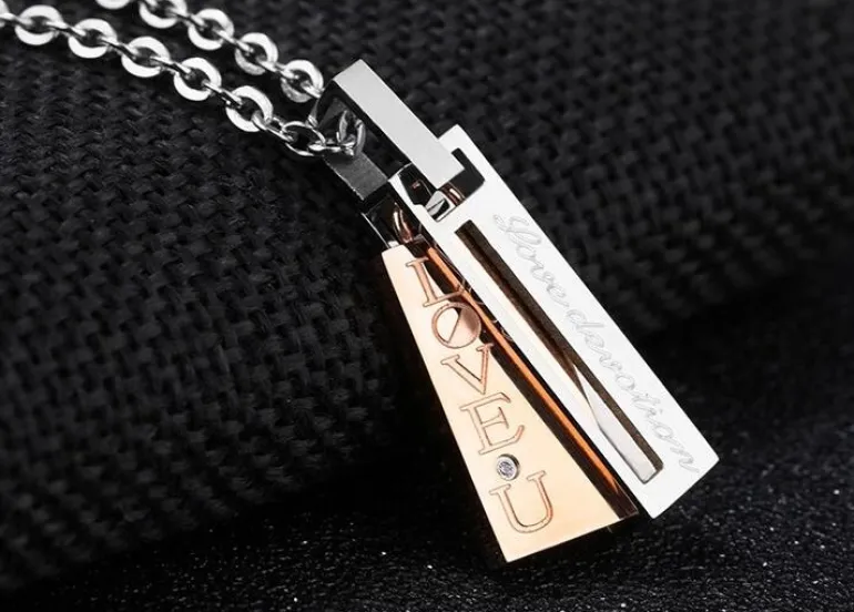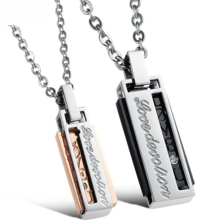 Stilede og moderne parhalskæder i rustfri nikkelfri stål med zirkon perle og tekst – hendes vedhæng er med gylden plade og hans med sort. Vis omverdenen at i hører sammen på flotteste vis.
