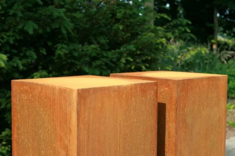 CorTen anvendt her er en meget stærk 2mm stål/alu sammensætning som har den egenskab at det dækker sig selv med overfladerust, som også er beskyttende imod direkte korrossion af materialet når de er placeret udendørs.