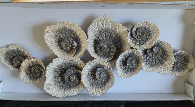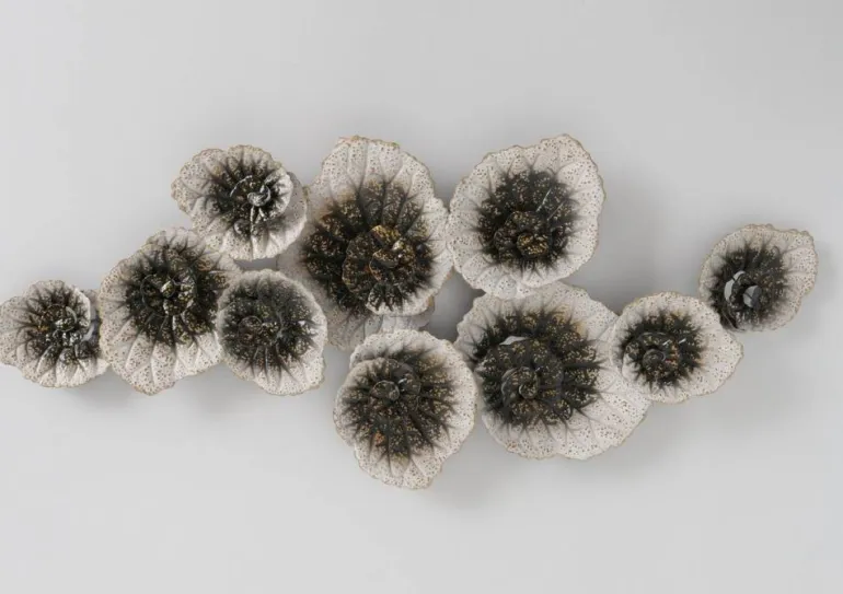 Flower twist vægrelief med abstrakte blomsterhoveder som er håndmalet – L.132xH.55cm
