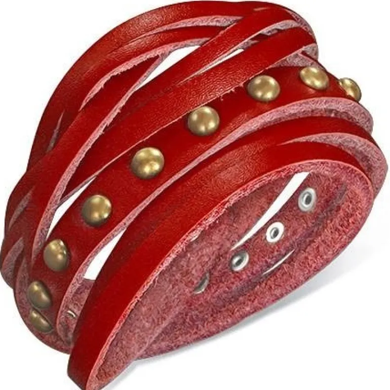 Wrap læderarmbånd i rød læder med messing nitter – dobbelt der snoes 2 gange rundt om håndleddet.