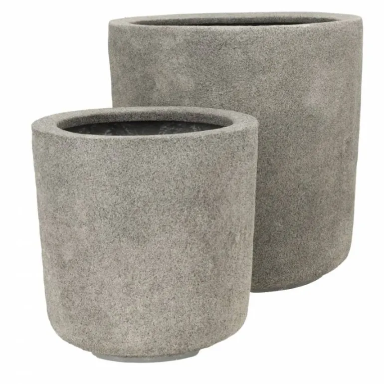 Rund let konisk krukke i letvægtsmateriale / glasfiber med rå overflade i grå sandsten look – 27x27cm eller 37x37cm – 5 års garanti