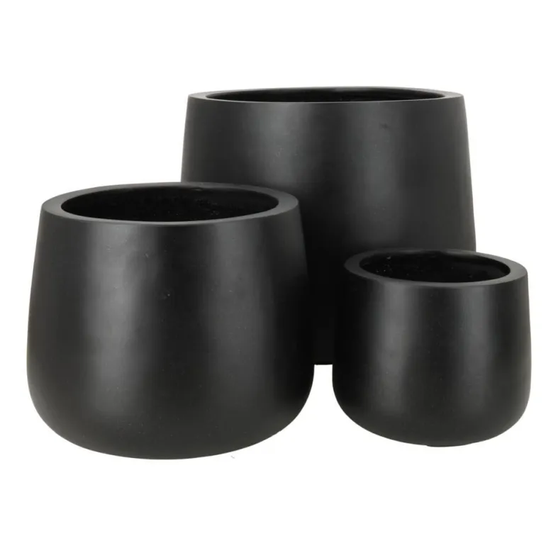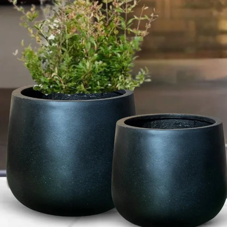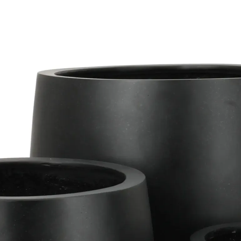 Runde let koniske udendørs frostsikre Franoma krukker i matsort glasfiber til haven og terrassen.
