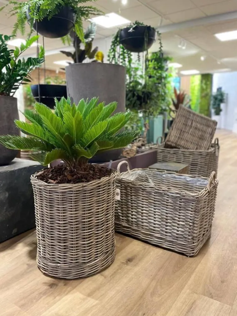 Praktisk løsning til dig der vil have mulighed for at flytte dine krukker og planter rundt med et snuptag – Her får du runde flettede krukker i rattan / pil med håndtag, plastindsats og 4 stk hjul på hver krukke – nem rengøring og mange muligheder for ny indretning.