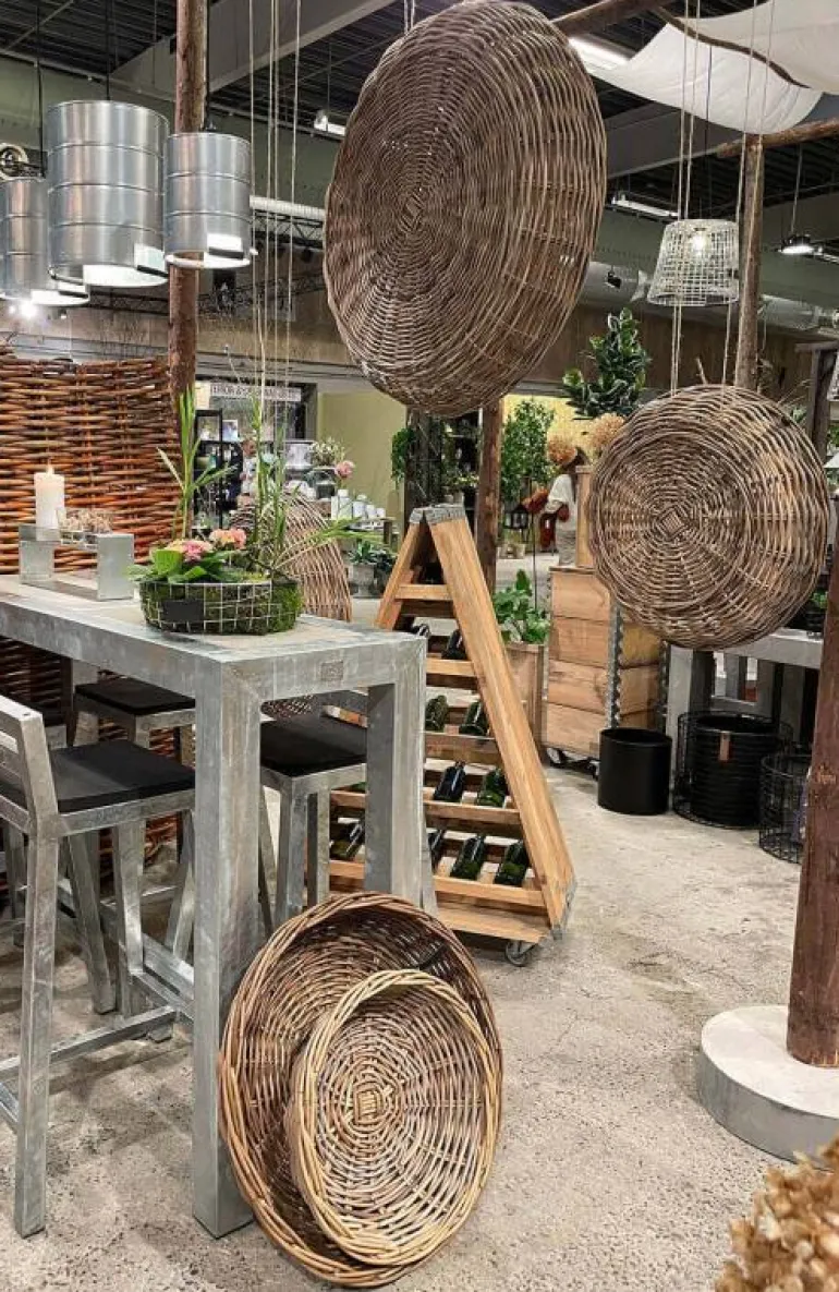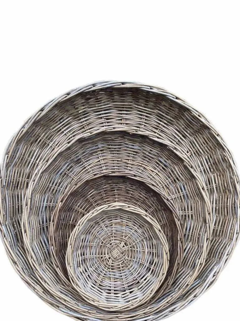Her får du et helt sæt med 4stk store runde håndflettede i særdeles god kvalitet. Bør primært anvendes indendørs til planter eller dekoration.