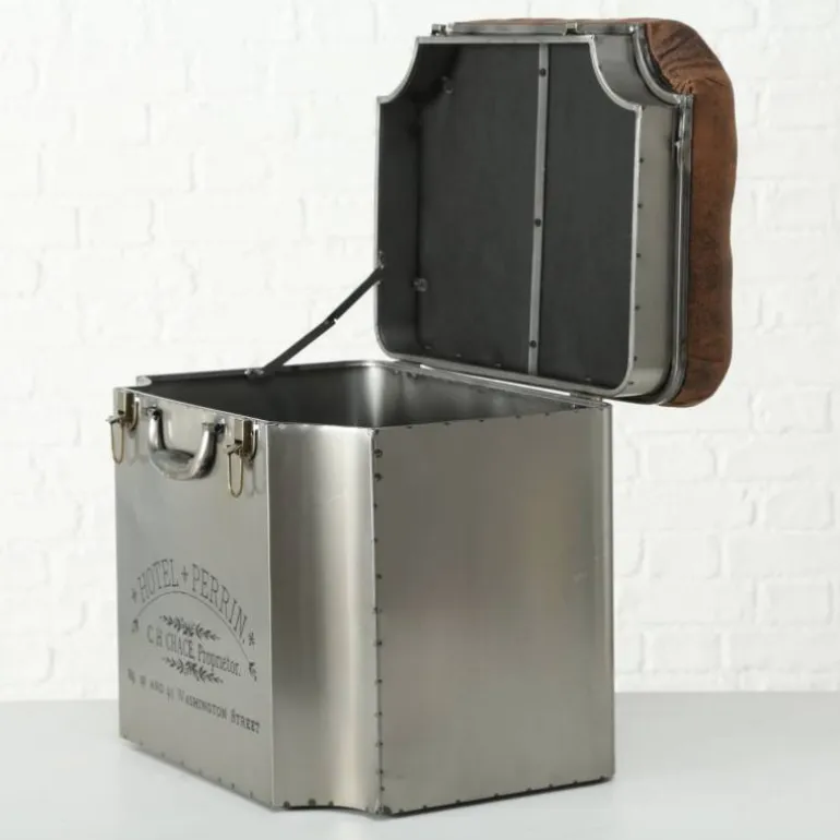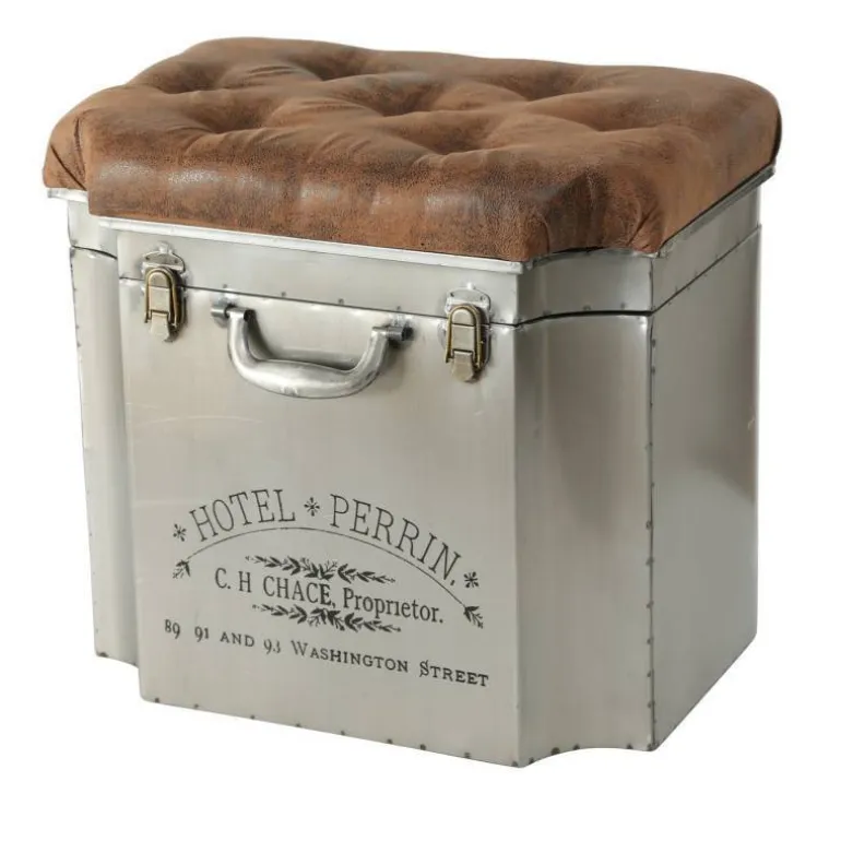 Flot skammel i metal med print og låg – sæde i stof læderlook.