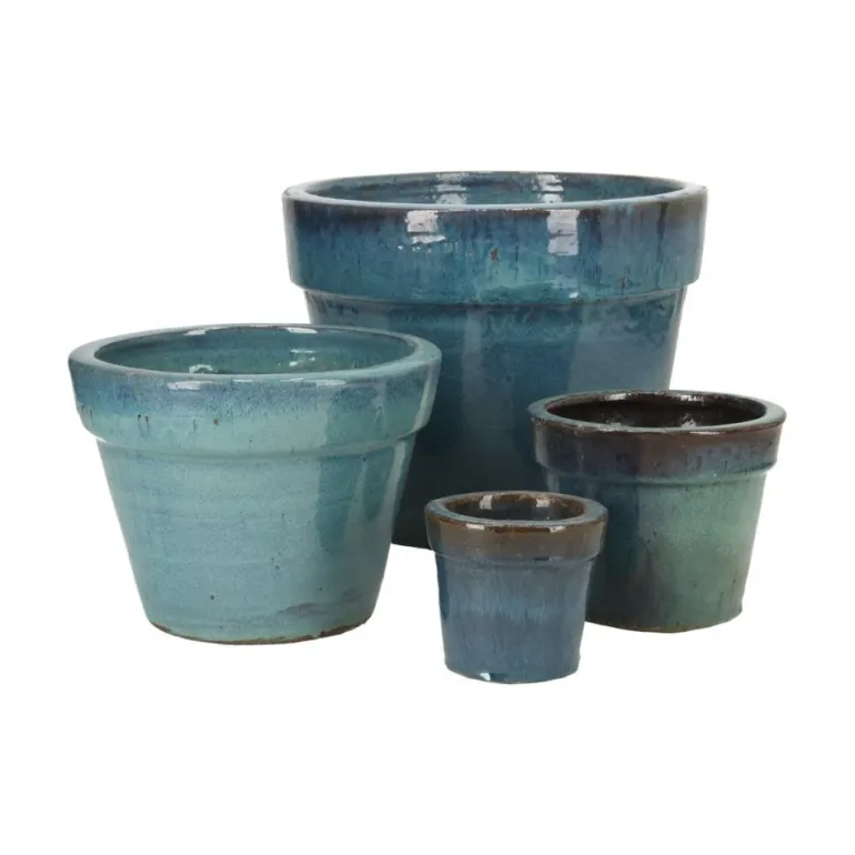 Krukkesæt i glaseret keramik med konisk form og bundhul – passende til altanen eller den lille terrasse. Kongeblå eller jadegrøn.