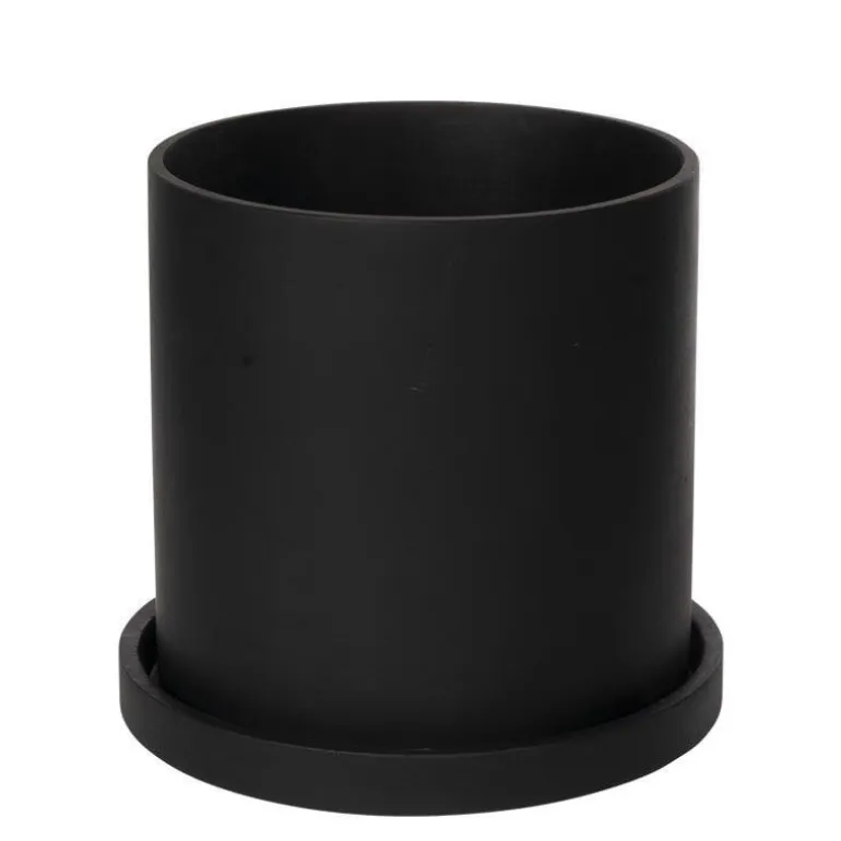 Stilren og tidløs sort mat blomsterpotte / krukke i holdbar fiberstone med underfad, som evt også kan bruges med låg til anden anvendelse end planter.