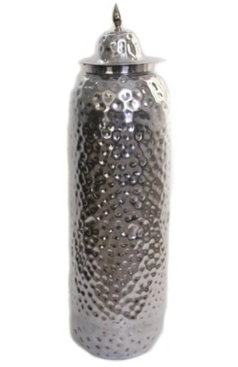 Super speciel hamret gulvvase med låg til grene, dekorationer eller bare som flot blikfang – fremstillet i hamret højpoleret aluminium og taler sit helt eget sprog når lyset rammer den