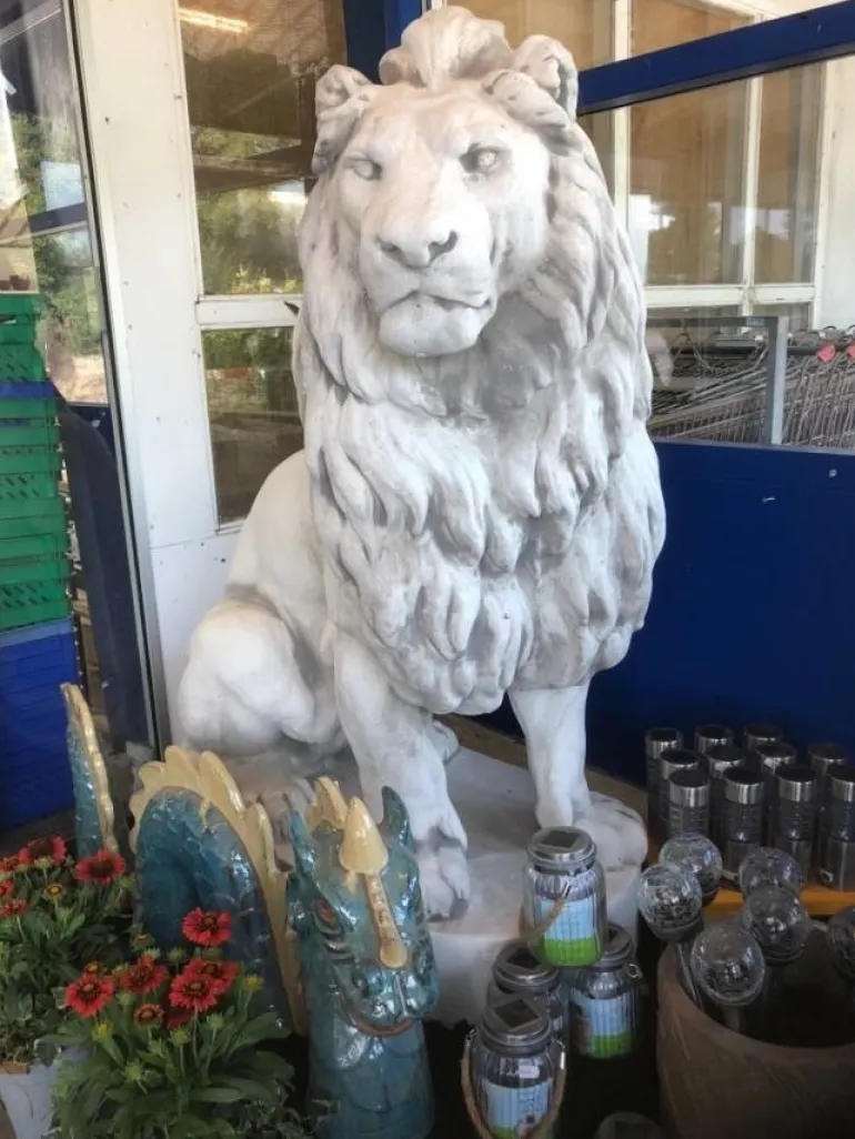 Pompøse og super flotte frostsikre løver i hvid beton/sten på sokkel.