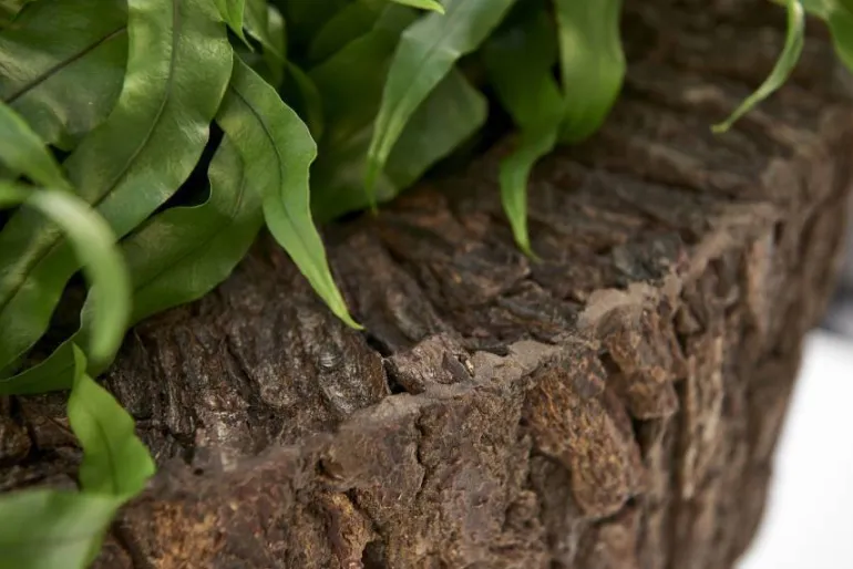 Smukke og specielle høje med rigtig træbark – Disse krukker er kun til indendørs anvendelse og der skal anvendes planteindsats for at vandsikre krukken. Selve kernen i krukken er glasfiber.