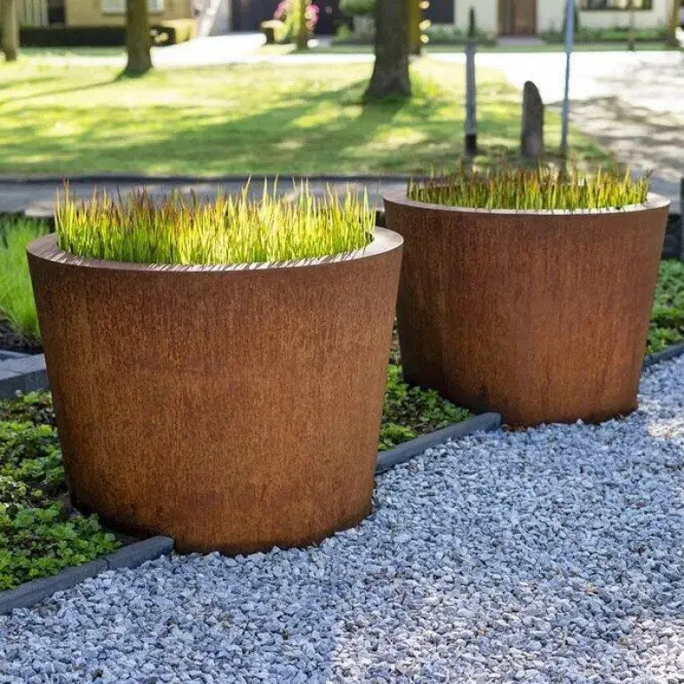 Her får du store plantekummer som indenfor 5-6 måneder får den eftertragtede rustfarve. Når kummerne bliver leveret er de i metalfarve (se billed eksempel), og får stille og roligt den rustpatina som du ser på billederne.