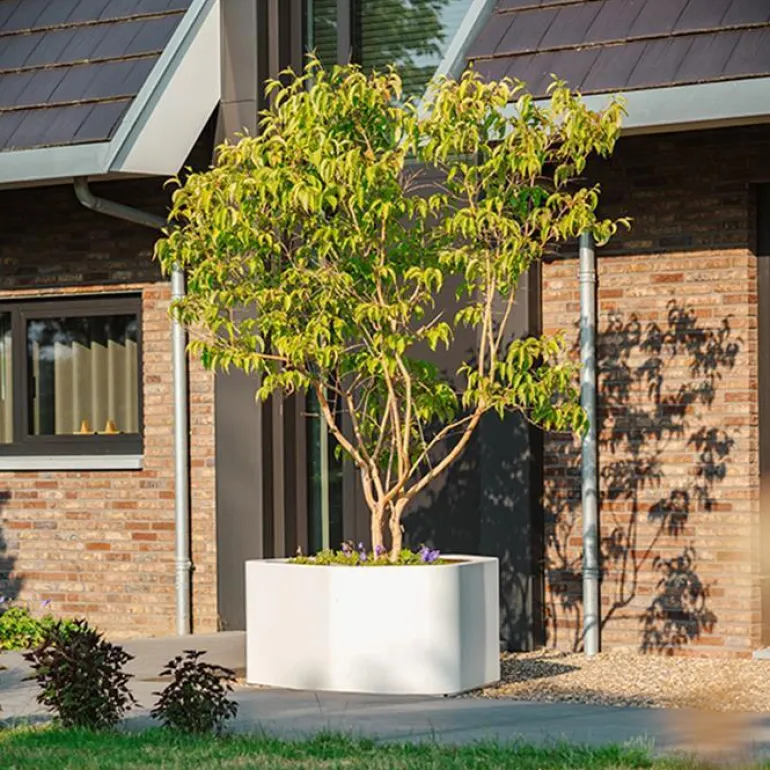 Store flotte organiske og abtrakte 6 kantede plantekummer i mat glasfiber – 3 farver – indendørs og udendørs.