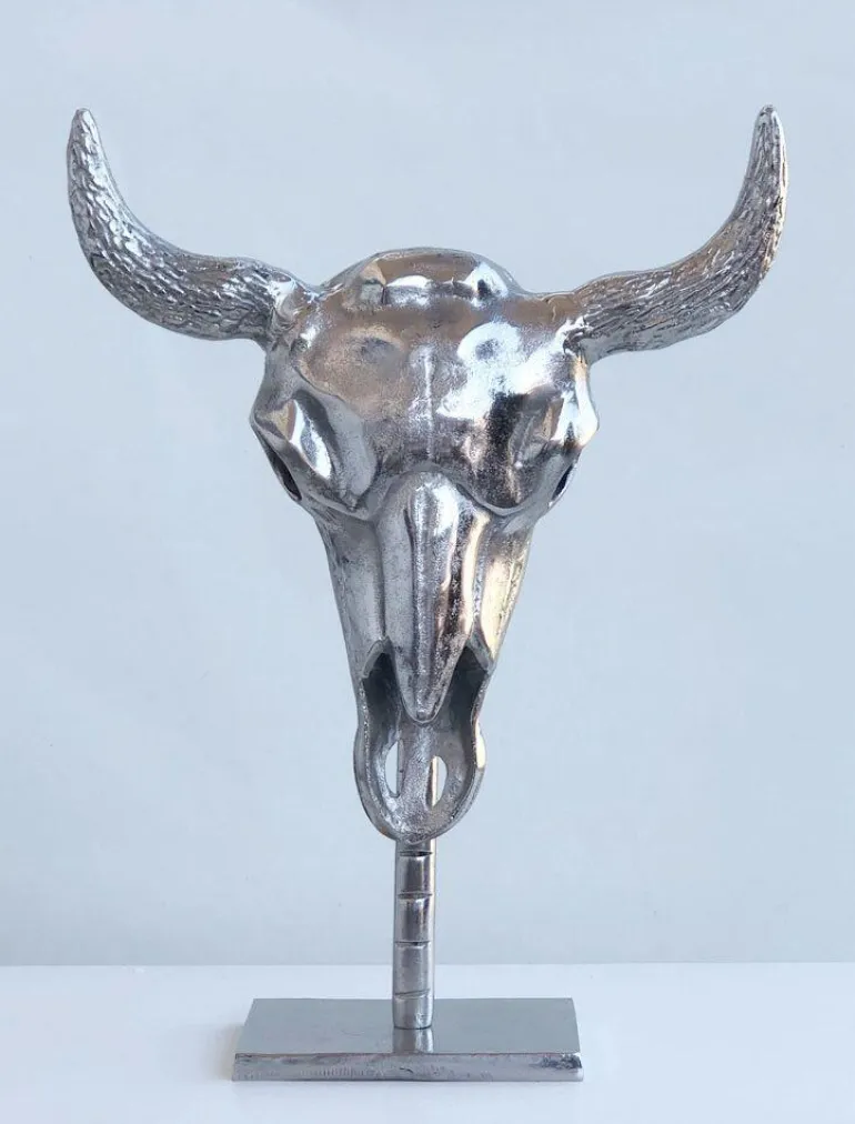 Naturtro tyrehoved på fod og fremstillet i poleret aluminium – Maskulin dekoration til den moderne bolig.