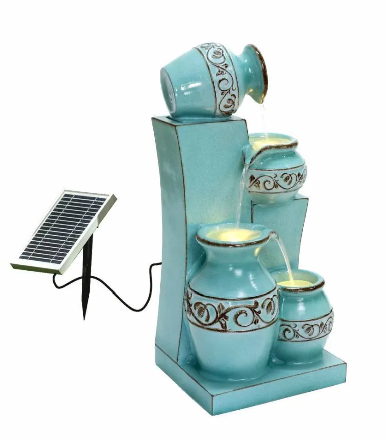 Rigtig flot og anderledes vandfontæne med 4stk vandkrukker med LED lys i hver, hvor vandet løber ned fra og skaber en dejlig vandlyd. Kan placeres lige hvor du ønsker da du ikke er afhængig af strøm.
