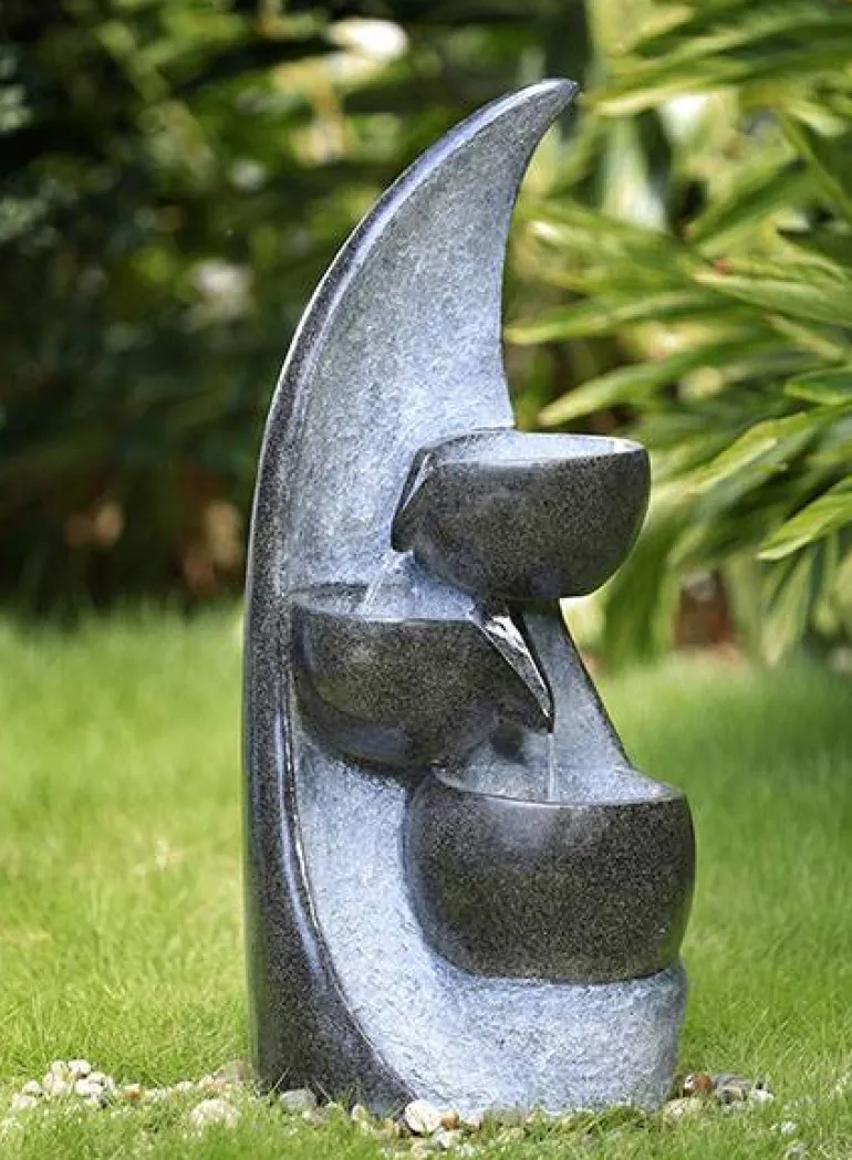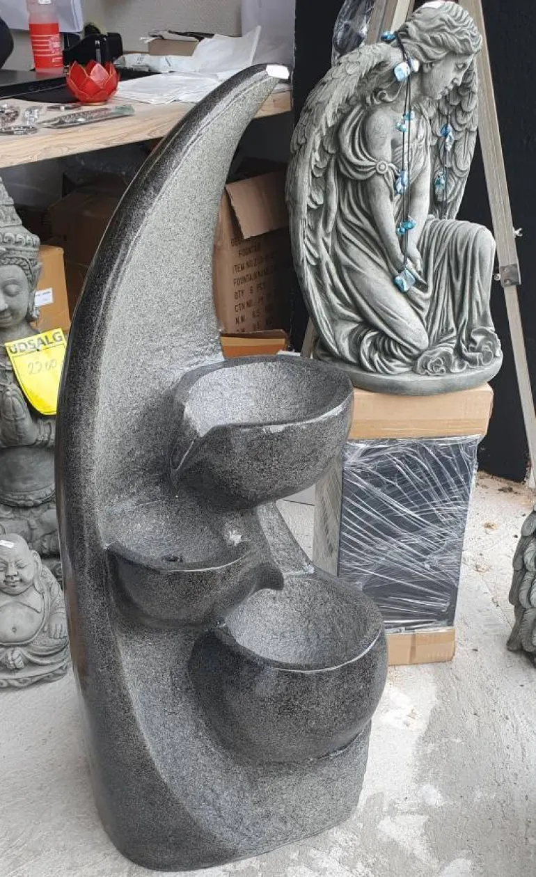 Rigtig flot og holdbar fremstillet i polystone/glasfiber med let Terrazzo look. Designet som en bølge med 3 sorte krukker hvor vandet løber fra.